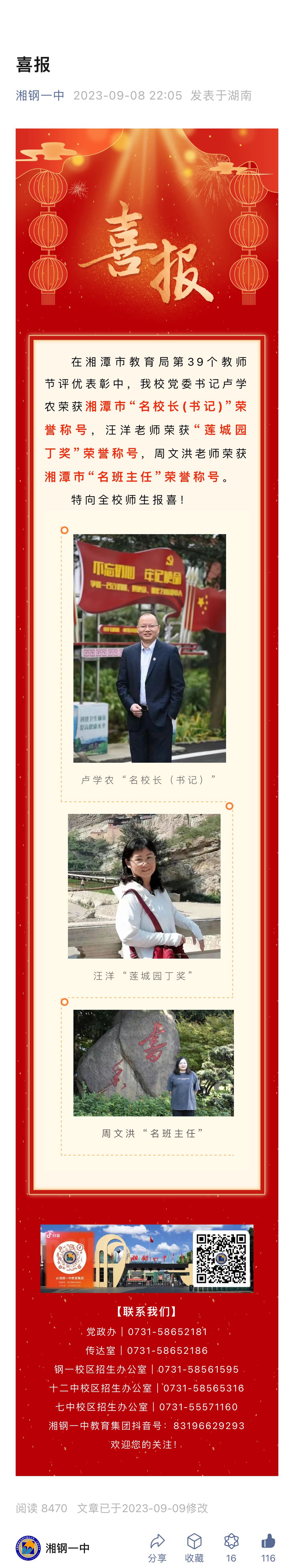 喜報:在湘潭市教育局第39個教師節(jié)評優(yōu)表彰中,我校黨委書記盧學(xué)農(nóng)榮獲湘潭市“名校長(書記)”榮譽(yù)稱號,汪洋老師榮獲“蓮城園丁獎”榮譽(yù)稱號,周文洪老師榮獲湘潭市“名班主任”榮譽(yù)稱號。