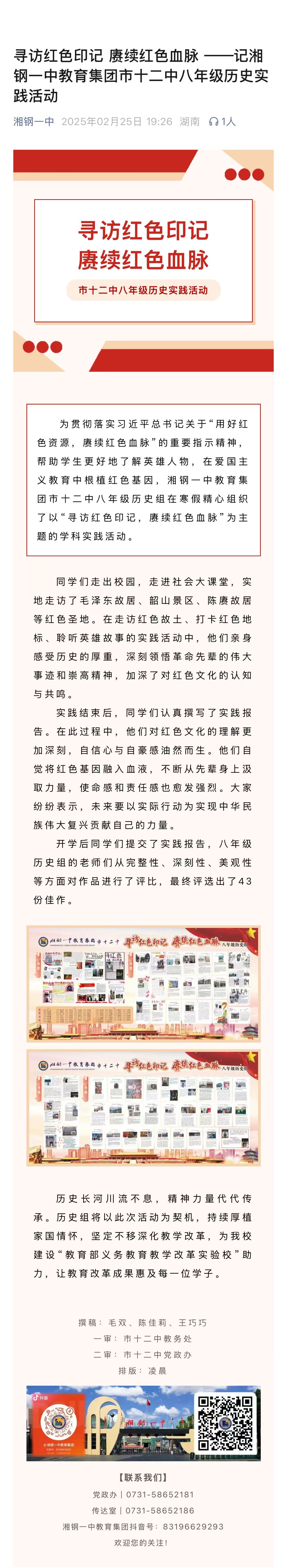 尋訪紅色印記 賡續(xù)紅色血脈 ——記湘鋼一中教育集團(tuán)市十二中八年級歷史實(shí)踐活動(dòng)