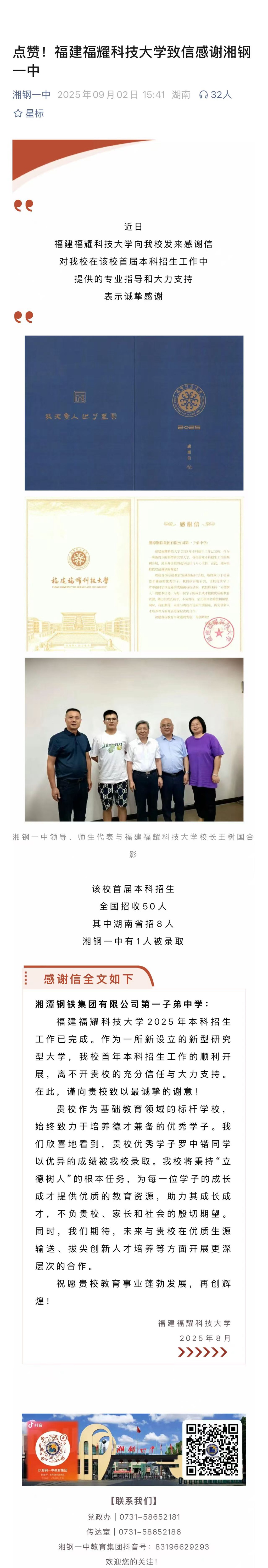 點(diǎn)贊!福建福耀科技大學(xué)致信感謝湘鋼一中